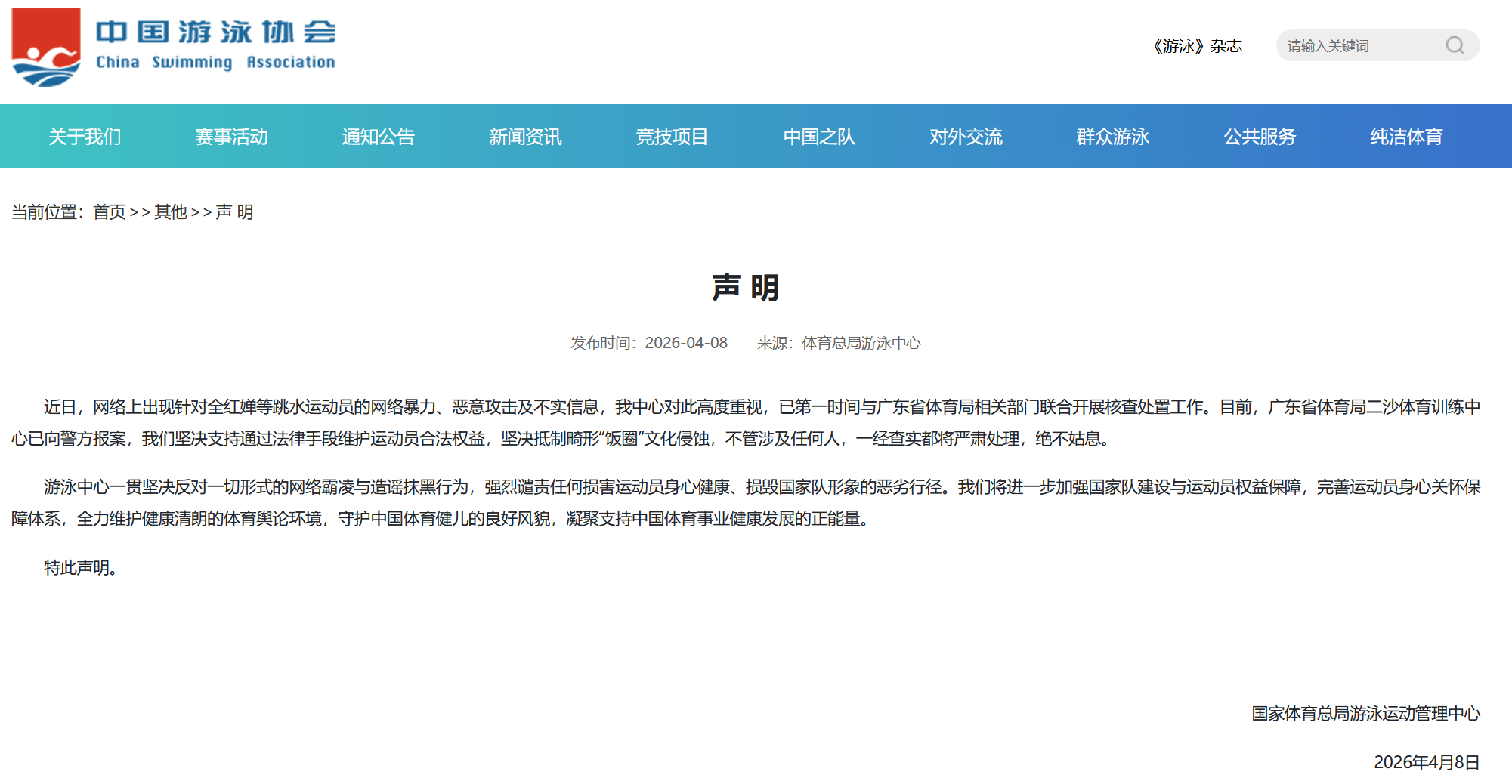 国度体育总局游水通顺管制中心4月8日发布声明: