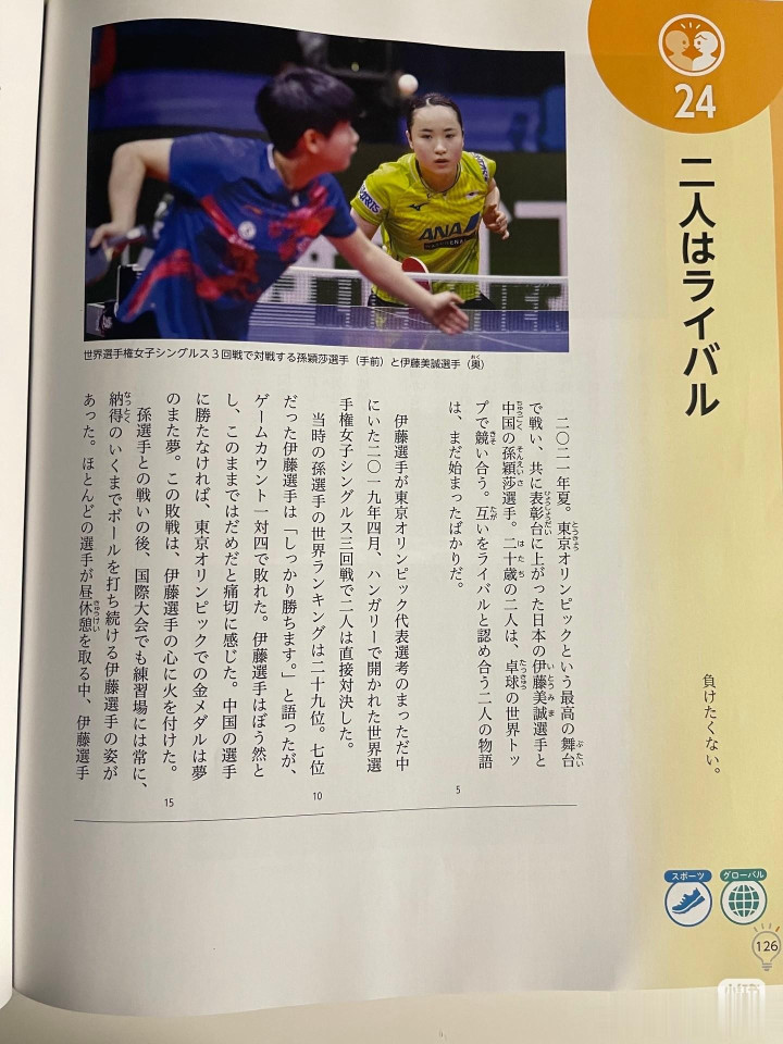 在这本课本中,以长文记叙了宇宙乒坛女王、国乒奥运冠军孙颖莎与日本奥运冠军伊藤好意思诚的四次经典对决,以孙颖莎在海外大赛中体现出的“尊重敌手,胜不骄败不馁”的体育精神激发日本中学生,让他们以孙颖莎为榜样,健康成长。