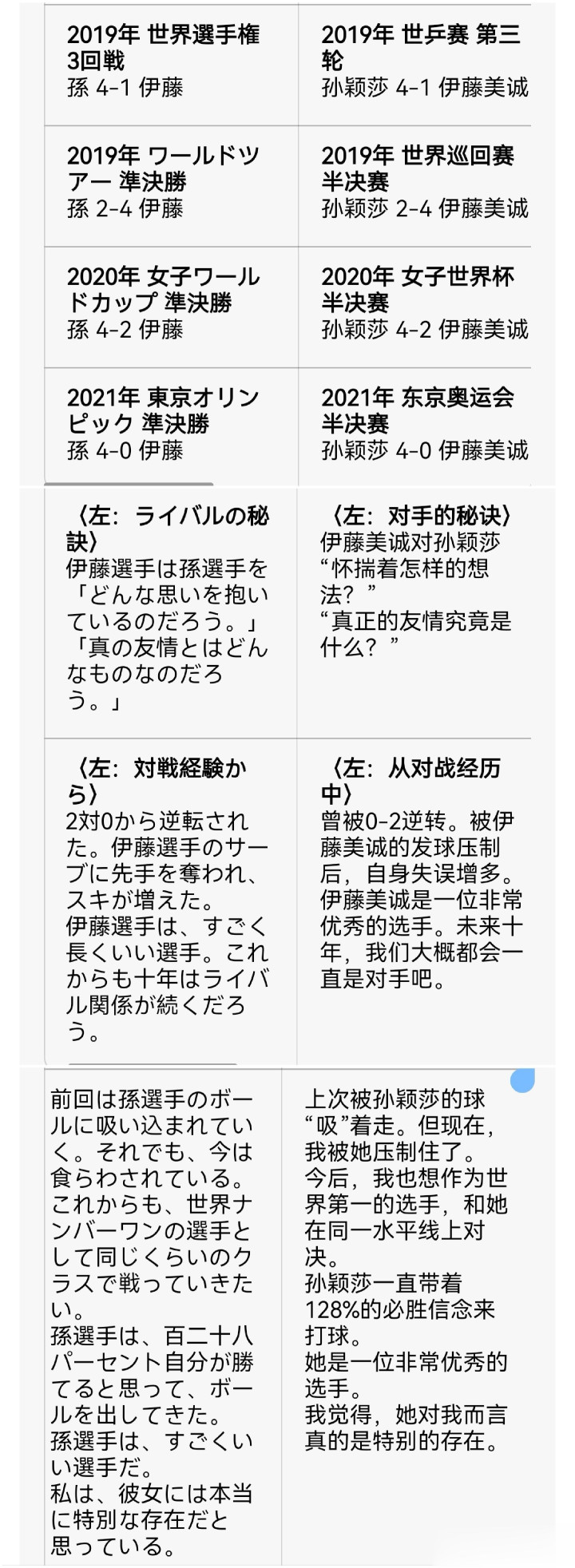 2020年疫情时分,为了备战东京奥运会,伊藤下决心前去中国进活动期38天的集训。令她没思到的是,在中国发生了一件她做事生存中前所未有的事情:她日思夜想思要对练的孙颖莎竟主动提倡要和她一说念考验,这对她来说是高高在上的提高球技的契机。两个东说念主欣慰肠对打着,莎莎开打趣说:“咱们这是在相互表露时代啊”,但两东说念主依旧毫无保留地把通盘看家圭臬齐诳骗到高质料的考验中。休息时,伊藤拿出姆妈亲手作念的饭团和莎莎一说念共享,莎莎连说可口可口。