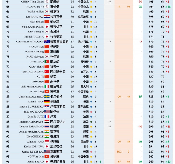 埃及选手梅谢芙减掉25个积分下落三位,排名第50位。考夫蔓减掉20个积分排名下滑四位,宇宙排名59位。台北选手黄愉偼在WTT支线赛事得到亚军,得到78个积分,飞腾了18个排名来到了第65名。泰国选手帕拉南减掉40个积分,下滑了11位来到了第89名。