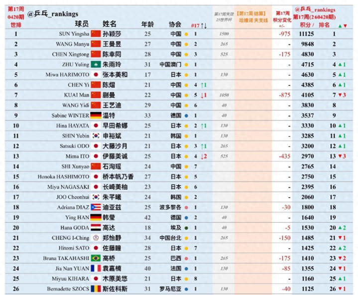 本年伊藤好意思诚谢宇宙杯赛的16进8亦然提前遇到了王曼昱,是以留步16强积分减少。遇到一个好的抽签分组有益于选手积分的陶冶,尤其是在大赛当中。埃及小将汉娜.高达天然减掉了五个积分,但排名飞腾两位来到了第20名。高达亦然处事活命初度参预宇宙前20的排名,她差点谢宇宙杯赛爆冷打败孙颖莎。