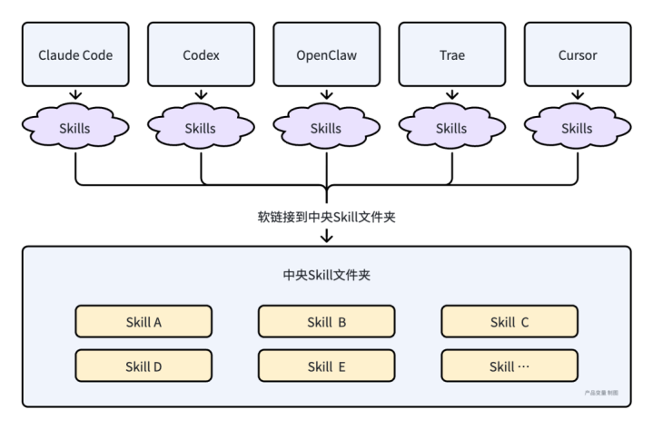 这些Agent器具多了之后,我发现了一个头大的问题,Skill不好料理,每个Agent皆有零丁的Skill文献夹,默许景况下彼此防碍,互不感知。