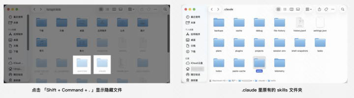 此刻Claude、OpenClaw等哄骗的目次皆在荫藏景况,点击快捷键Shift+Command+.,让荫藏文献夹展示出来,就能看到.claude、.openclaw等哄骗目次;