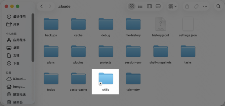再次回到.claude文献夹,就会看到,目次里又多了一个skills文献夹,只不外这个文献夹图标上,出现了一个小箭头「