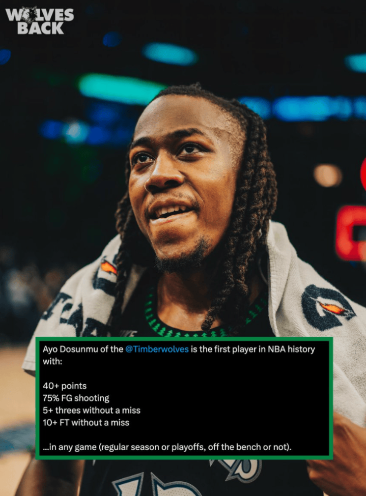 全场比赛,丛林狼后卫阿约-多森姆替补登场42分钟,17投13中,三分球5投5中,米兰体育罚球12罚12中获取43分4篮板1助攻1封盖。