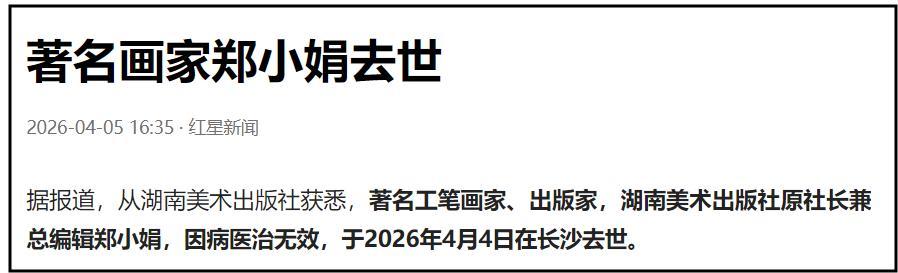 据媒体报谈,郑小娟因病医治无效,于2026年4月4日在长沙物化,享年85岁。