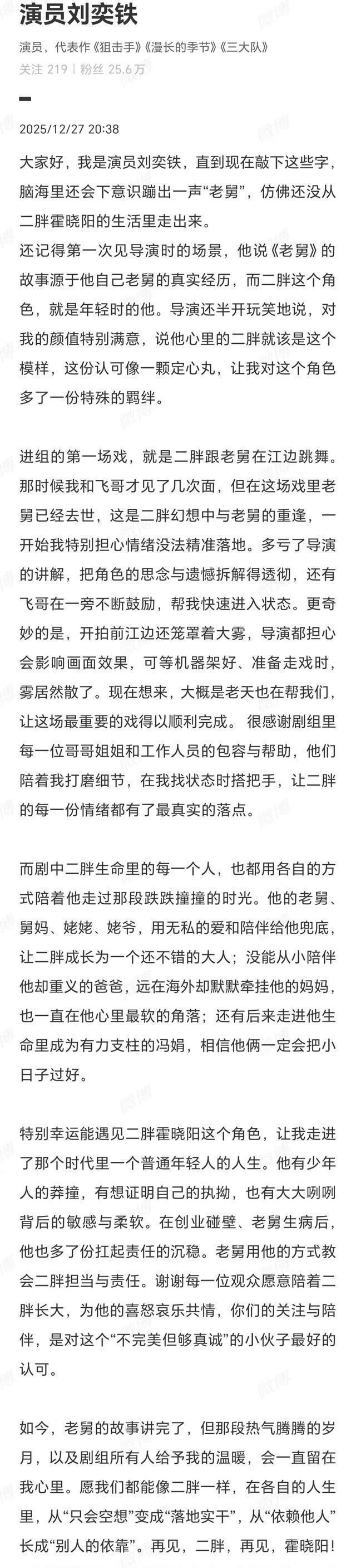 刘奕铁告别二胖,写了很长的小作文,也表露了好多信息。底本二胖这个扮装,便是年青时的导演,故事源于导演我方老舅的真确履历。