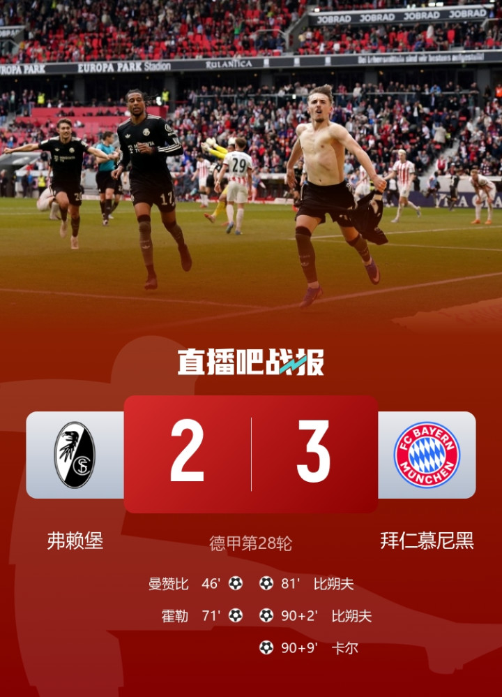 让二追三!拜仁3-2逆转弗赖堡先赛12分领跑比朔夫双响卡尔绝杀