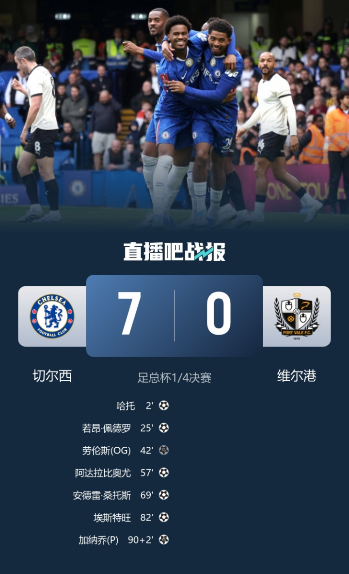 止4连败!切尔西7-0大捷维尔港进足总杯4强埃斯特旺传射+两中柱