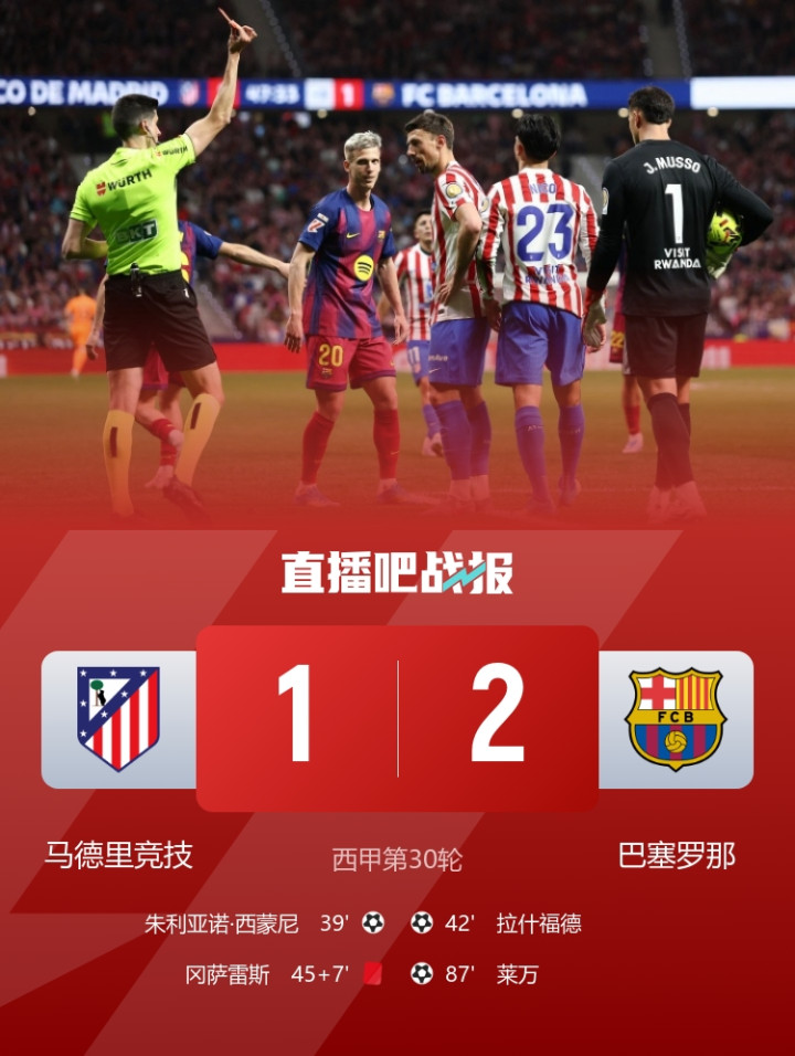 莱万绝杀!巴萨2-1逆转十东谈主马竞冈萨雷斯1黄1直红马丁直红改黄牌