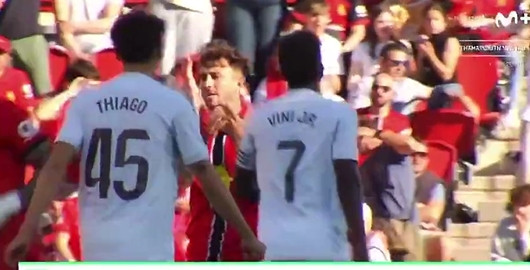 本轮西甲,马略卡2-1绝杀皇马。《马卡报》征引了转播方Movistar+对比赛的直击画面,发现了一个细节:替补登场的维尼修斯与马略卡边后卫马菲奥之间依旧是炸药味满满。