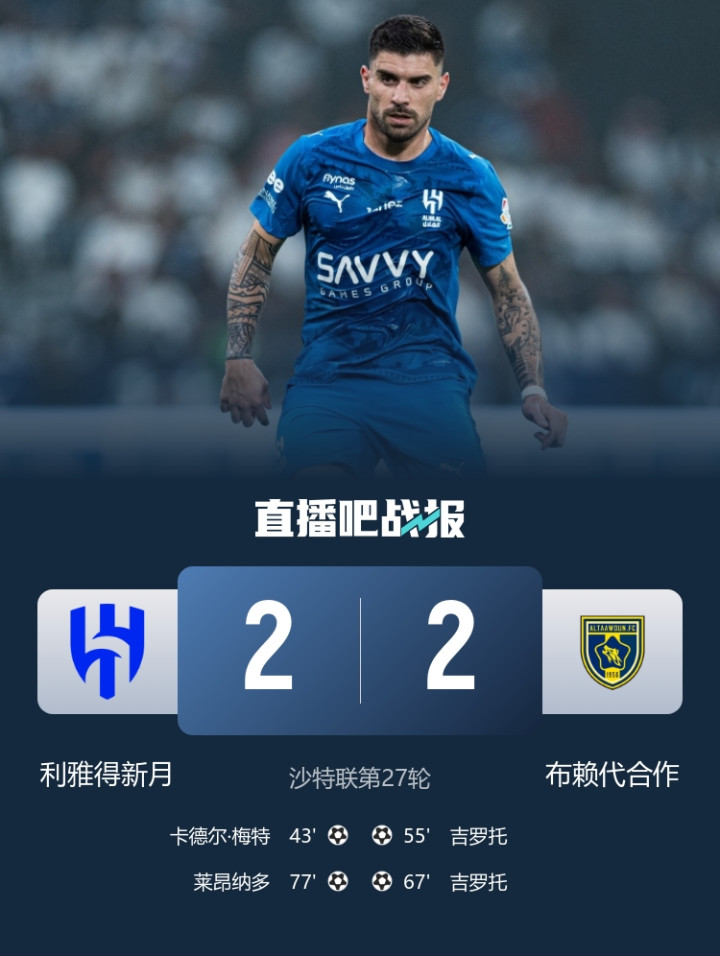 3连胜已矣!利雅得月牙2-2布赖代谐和距榜首5分梅特莱昂纳多破门