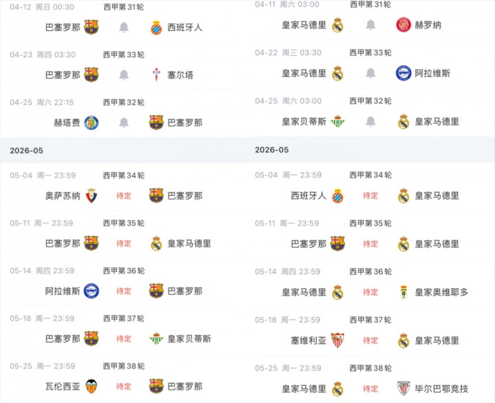 巴萨剩8轮7分领跑!巴萨、皇马剩余赛程对比:第35轮国度德比