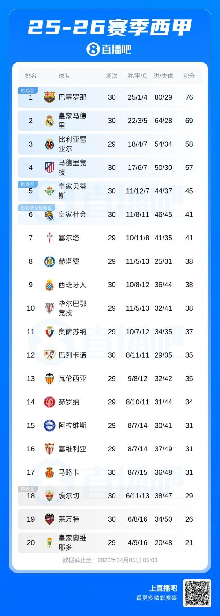 西甲积分榜:巴萨绝杀马竞7分上风领跑皇马本轮先赛被马略卡绝杀
