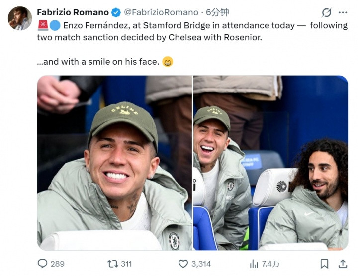 恩佐因为此序论论,被切尔西里面惩办禁赛两场。今天恩佐现身斯坦福桥不雅战,看起来情绪可以。罗马诺发文报谈。