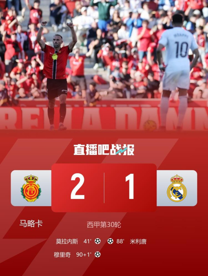 爆冷!皇马1-2遭马略卡绝杀皇马各赛事5连胜已矣、过期榜首7分