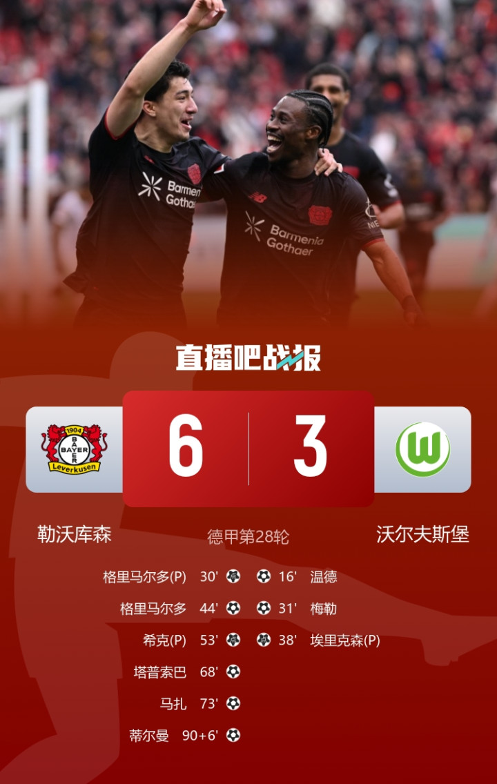 勒沃库森1-3过期连入5球逆转,不竭名按序6,沃尔夫斯堡仍处左迁区;格里马尔多双响。