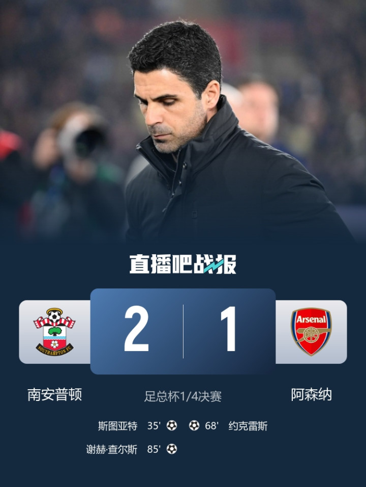爆冷!阿森纳1-2圣徒留步足总杯八强约克雷斯破门难救主加布伤退
