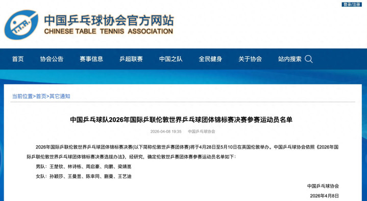 中国乒乓球协会依照《2026年外洋乒联伦敦世界乒乓球团体锦标赛决赛遴荐主义》,详情伦敦世乒赛团体赛参赛通晓员名单如下: